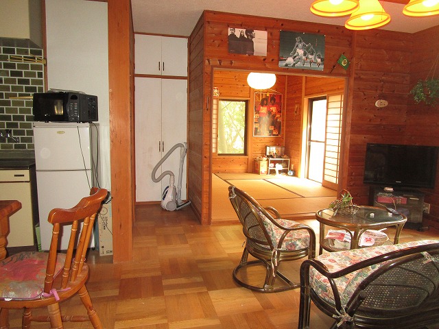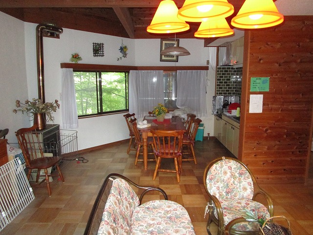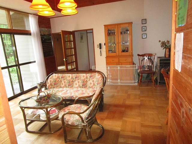 物件は別荘地の真ん中位にあります。敷地は平坦、建物は平屋です。室内は広いリビングとそこからお庭に出れる開放感が魅力です。